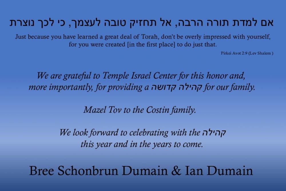 Mazal Tov! We owe many thanks to Sandra, Dan, Bree and Ian for their extraordinary devotion to strengthening our community. Tamar Prager and Arielle Freedberg Prager To our very dear friends Sandra, Dan, Bree and Ian: Each of you is very special to us. Mazal tov from our family to yours. Rabbi Dina Shargel and David Projansky Mazal Tov on this well-deserved honor Sandra & Dan and Bree & Ian. We're so grateful for your devotion to Temple Israel Center and for all you do to help insure our synagogue vibrancy here at TIC! Mary Ann & Bob Sacks Mazal Tov to honorees Sandra & Dan Costin and Bree Schonbrun Dumain & Ian Dumain Ilana and Rob Saposh Supporter