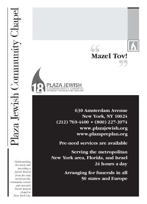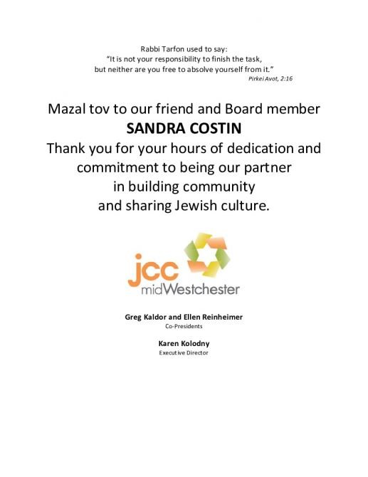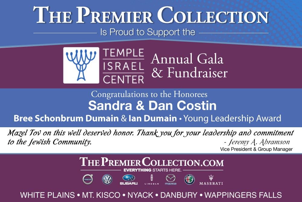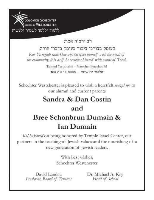 Mazel Tov to Sandra and Dan Costin on this well deserved honor. May Hashem keep blessing you with health and nachas. Wendy, David, Sara & Samantha Herlands Mazal Tov to honorees Sandra & Dan Costin and Bree Schonbrun Dumain & Ian Dumain Gila Wilensky & Rabbi Ari Isenberg Mazal Tov to the Temple Israel Center community. Jeffrey Porter/All Time Detection Mazel Tov to Bree and Sandra. Thank you for all your hard work. Love, Amy & Mitchell Josephs Supporter