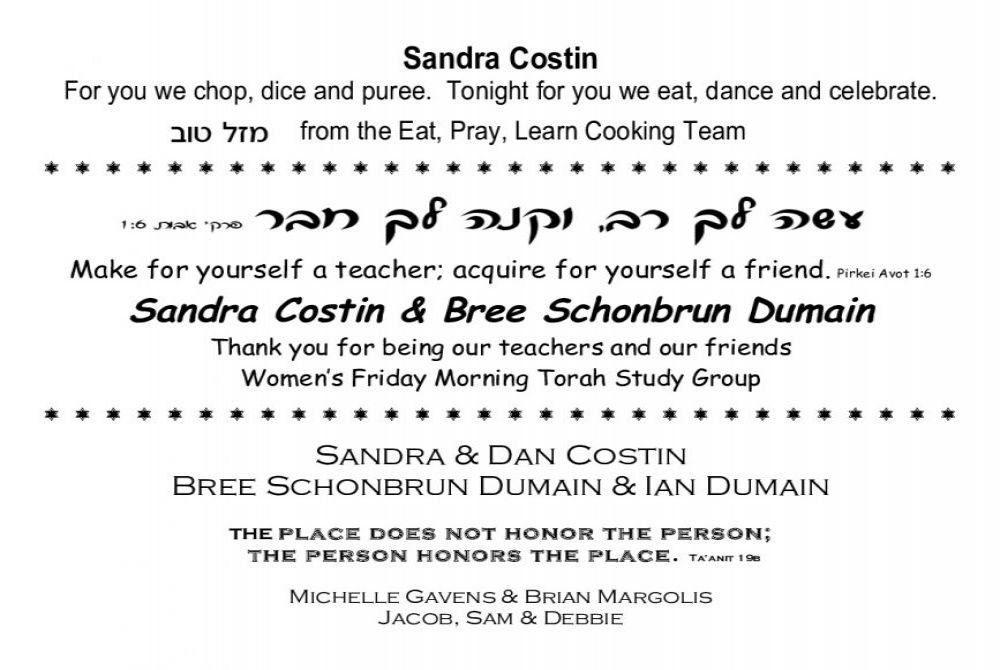 Sandra and Dan, You mean the world to us- raising our children together, sharing our celebrations and sorrows, learning and studying together. You both help build circles of community. Your values and passions help define our kehilah and we are grateful.