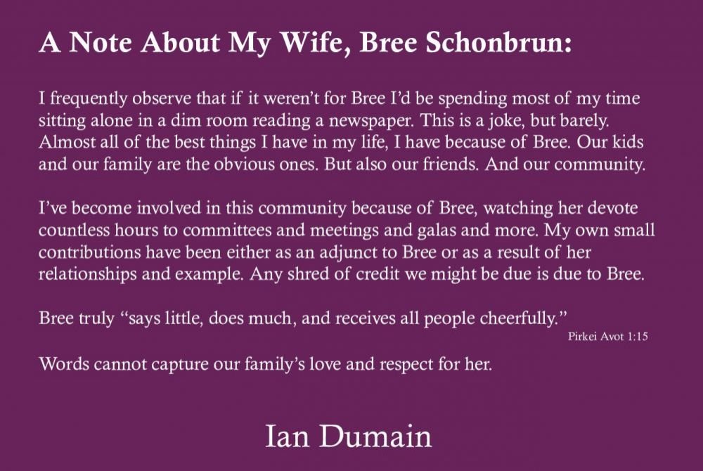 Mazal Tov to the well deserving honorees! Thank you for all that you so generously give to our community. May you go from strength to strength. Julie and Warren Breakstone Mazel tov Bree and Ian. We are so proud of you. We love you guys! Sarit, Gabe, Jack, Eli and Jane Brecher Donor