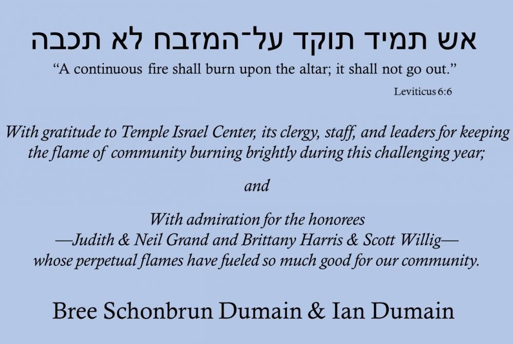 Gratitude & heartfelt thanks to Honorees Judith, Neil, Brittany & Scott for all that you do to strengthen our TIC community, especially in this most difficult time. --Estelle Argaman Mazal Tov to the Temple Israel Center community. Diana and Elan Ben-Avi Supporter