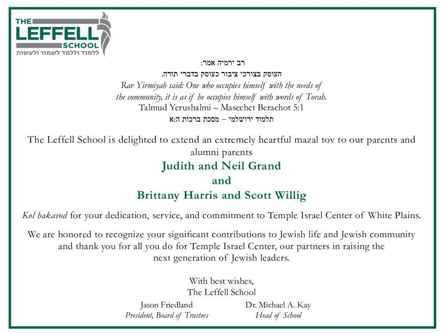 Mazal tov to Judith & Neil Grand, Honorees, and Brittany Harris & Scott Willig, Young Leadership Honorees. Howard and Natalia Kornstein Mazal tov to honorees Brittany Harris & Scott Willig. Ben, Julie, Nellie and Andi Leffell Mazel Tov to fellow PTO Board member Judith Grand & husband Neil on this well deserved honor. Congratulations to Leffell School parents Brittany Harris & Scott Willig on their honor. The Leffell School PTO Board Thank you to honorees Judith & Neil Grand and Brittany Harris & Scott Willig. Lewis Monument Company Donor