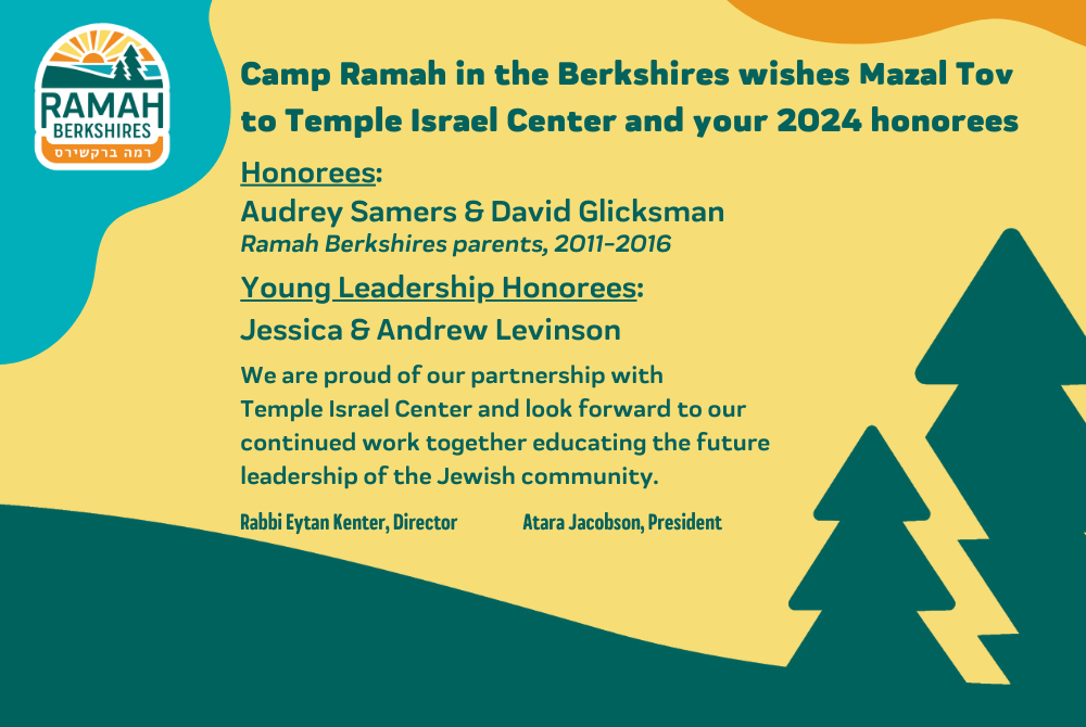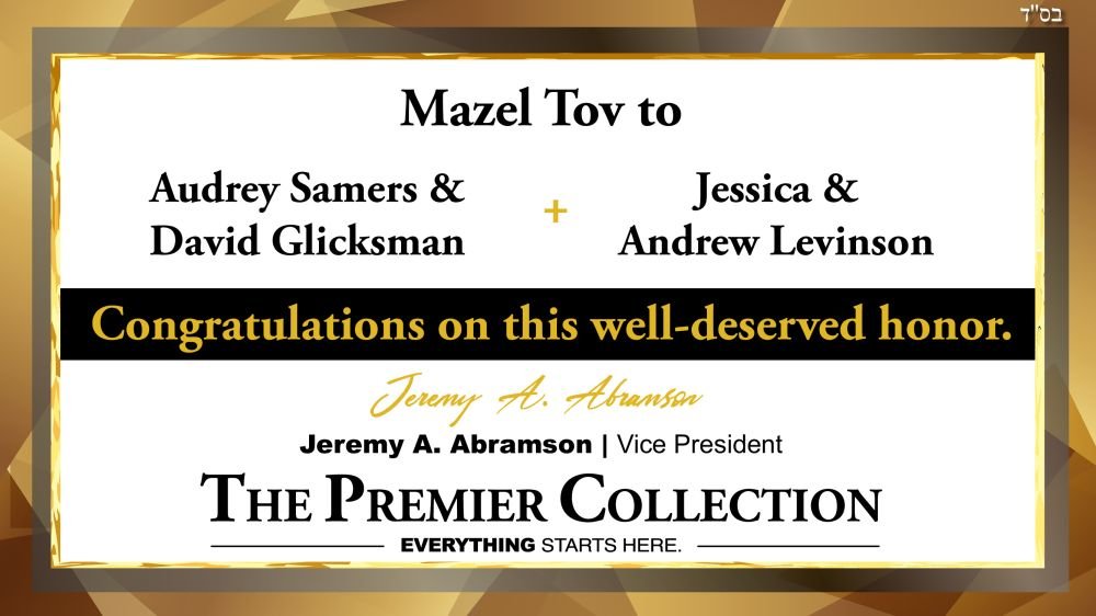Mazal tov to Honorees Audrey Samers & David Glicksman and Jessica & Andrew Levinson on their well-deserved honors. Reena and David Glick Mazal tov to Audrey and David, and to Jessica and Andrew. We are very grateful for your deep commitment to our community. Chari, Jacob and Louis Goldberg Donors