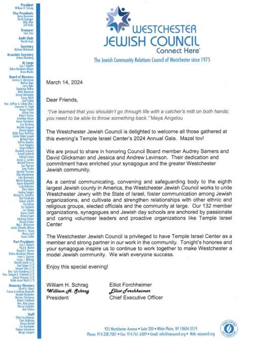 To our old friends, Audrey and David, thank you for being outstanding role models for the Jewish community. Am Yisrael Chai! Beth and Phil Waxman Mazal tov to Honorees Audrey Samers & David Glicksman and Jessica & Andrew Levinson on their well-deserved honors. Stacey and Stu Wechsler Donors