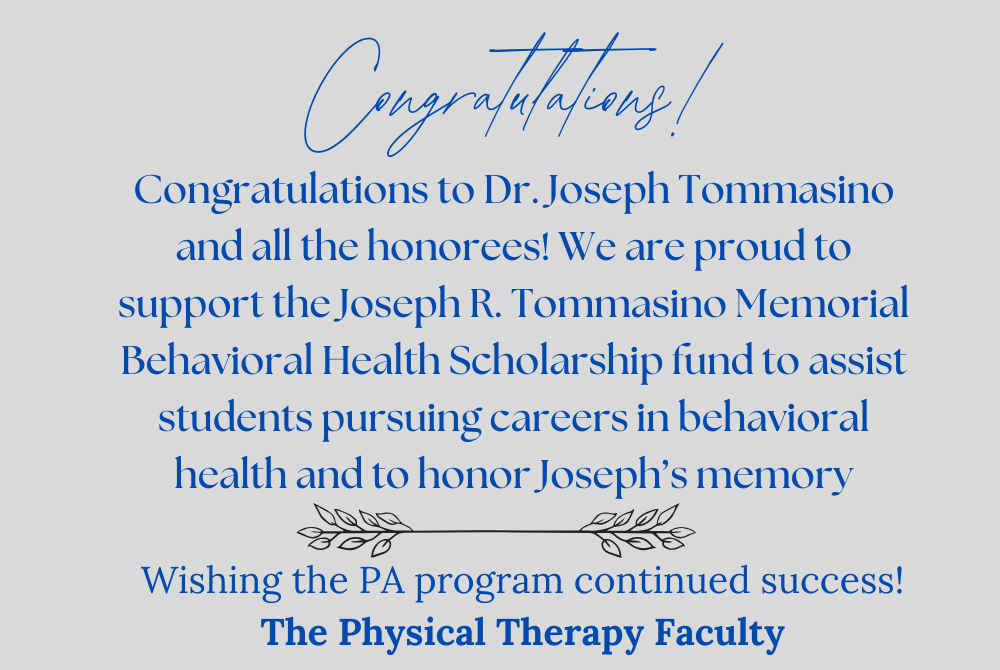 On a personal note, I owe a deep debt of gratitude to Dr. Tommasino for his guidance and mentorship, which have been instrumental in getting me to where I am today. His unwavering support, wisdom, and commitment to helping me grow professionally have made all the difference in my journey. This event, which raises awareness for the pressing need for behavioral health providers, is yet another testament to his visionary leadership. Dr. Tommasino's passion for enacting change and improving the future of healthcare resonates in every aspect of his work. He is not only shaping the next generation of PAs, but he is also ensuring that the field evolves to meet the ever-growing demands of our communities. Thank you, Dr. Tommasino, for all you have done, and continue to do, for all of us and for the future of healthcare.
