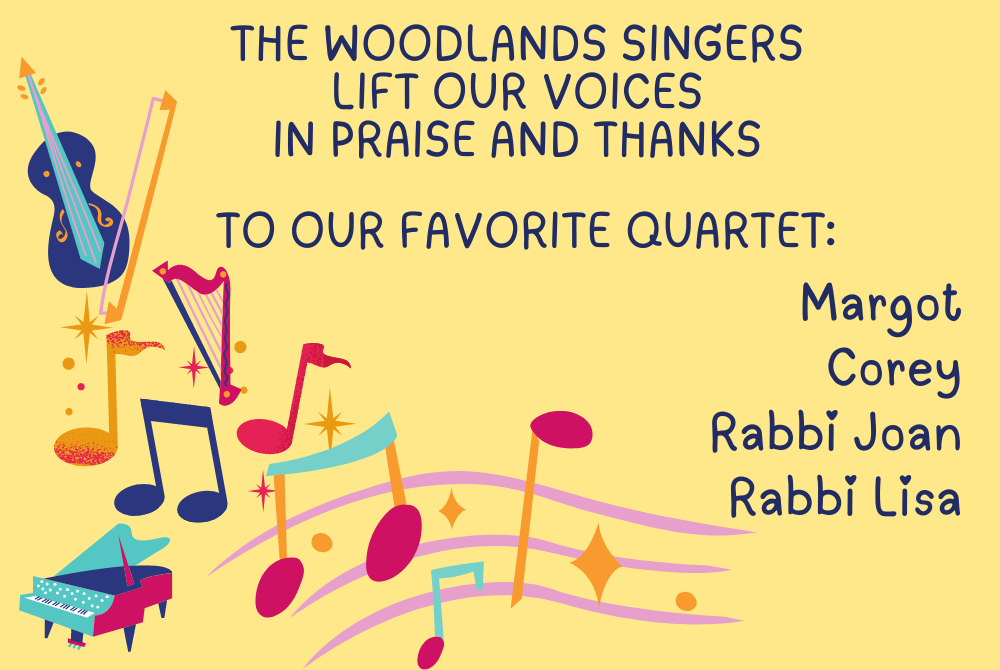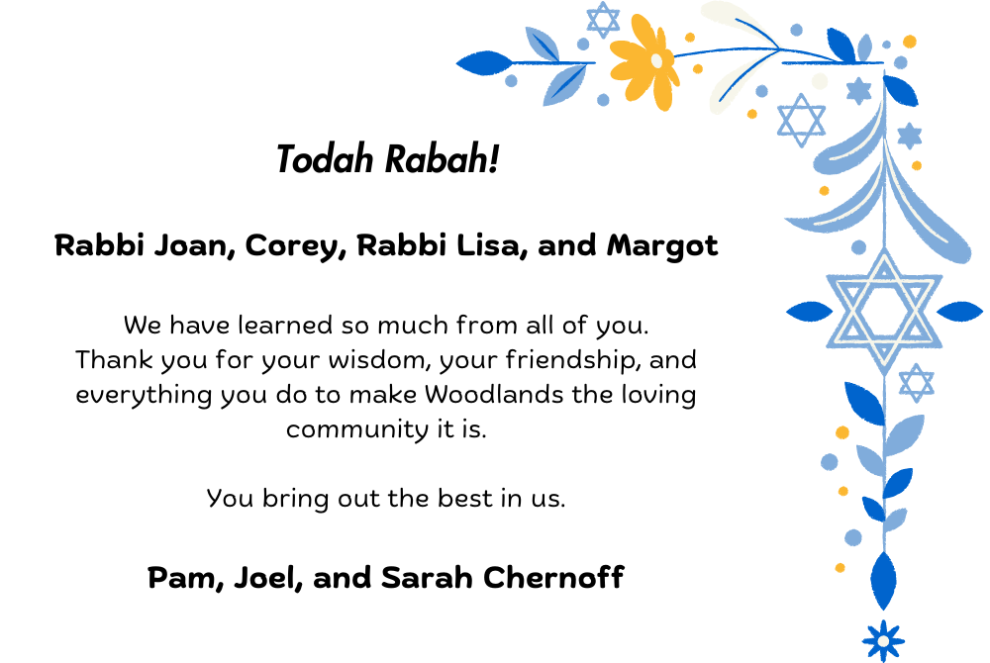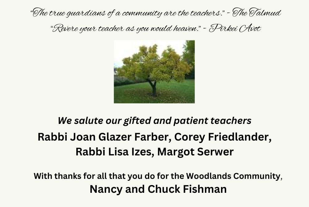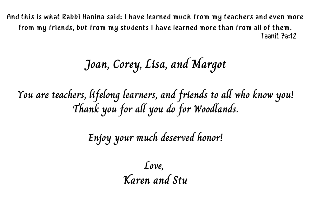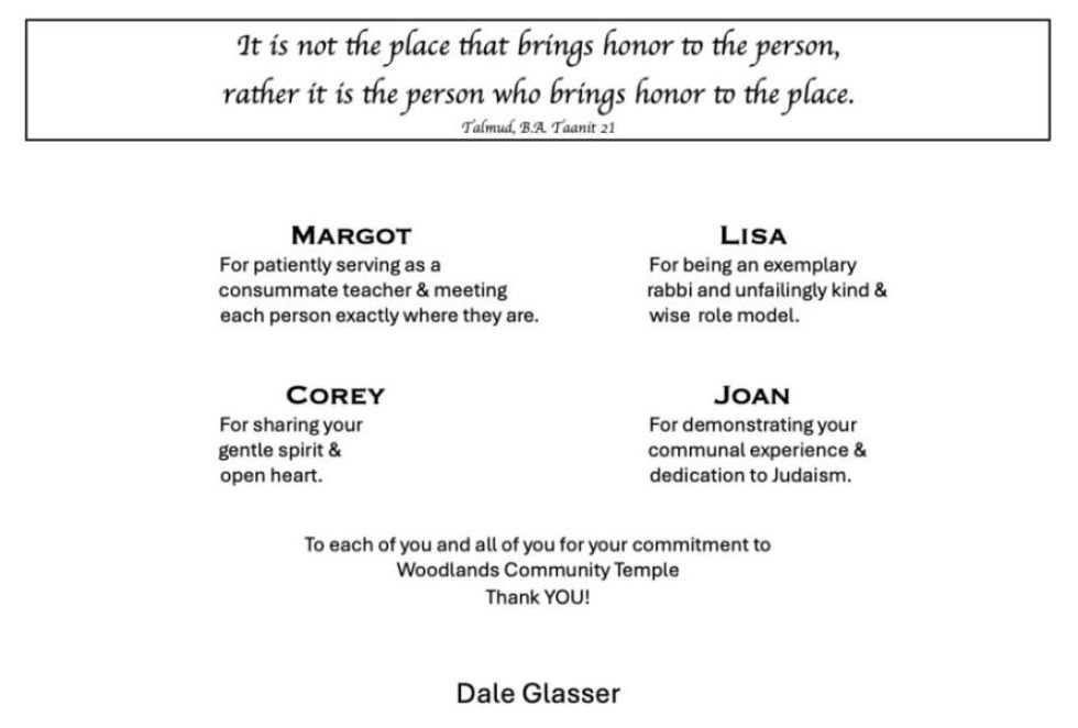 Woodlands has been blessed to have each and every one of you. You are all beautiful humans shining light on our congregation. It's an honor to celebrate you. Linda, Peter & Jaron Soboroff/Davidson To Four Outstanding Woodlands Members: Well Done! Best Wishes from the Thrope, Garmise & Wilson Families Woodlands is very fortunate to have four such amazing members. Congratulations! Mark & Liz Weinberg Deuteronomy/Devarim