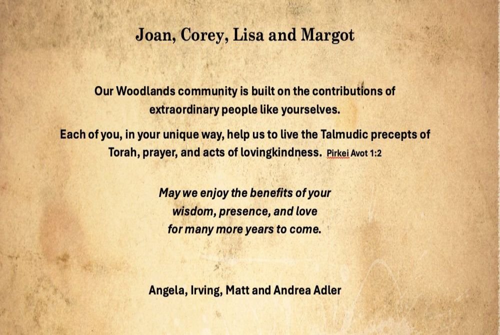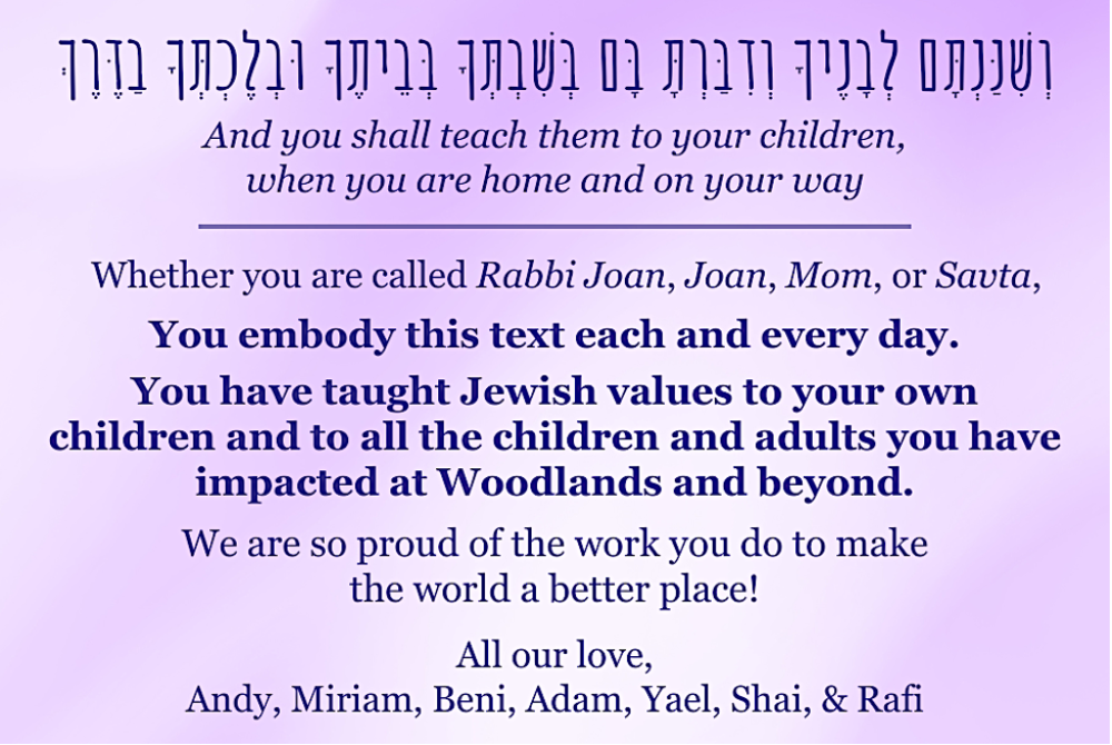 Joan, it is our honor to honor you. Love, Phyllis & Marc Newman Mazal tov to our wonderful colleagues: Joan, Corey, Lisa & Margot. Woodlands has benefited so much over the years from your many gifts! Much love, Rabbis Eve Rudin & Elliott Kleinman (& Emma!) Congratulations Joan on this well deserved honor! Wish we could be there to celebrate with you. With love, Martha, Peter & Family Deuteronomy/Devarim