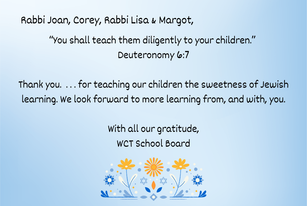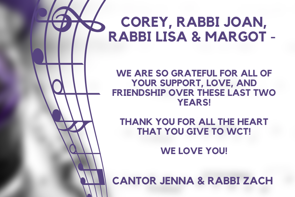 Your leadership and friendship are always inspiring! Mike & Trudy Holand May you continue to go "from strength to strength" (Psalm 84:7) in your incomparable service you give to this temple. Rabbi Neal Kaunfer Dear Corey, Joan, Lisa and Margot -- Mazal tov and todah merosh for all you bring to WCT! May you all go from strength to strength! Love from Rabbi Geoff Mitelman, Heather Stoltz, Caroline & Matthew Deuteronomy/Devarim