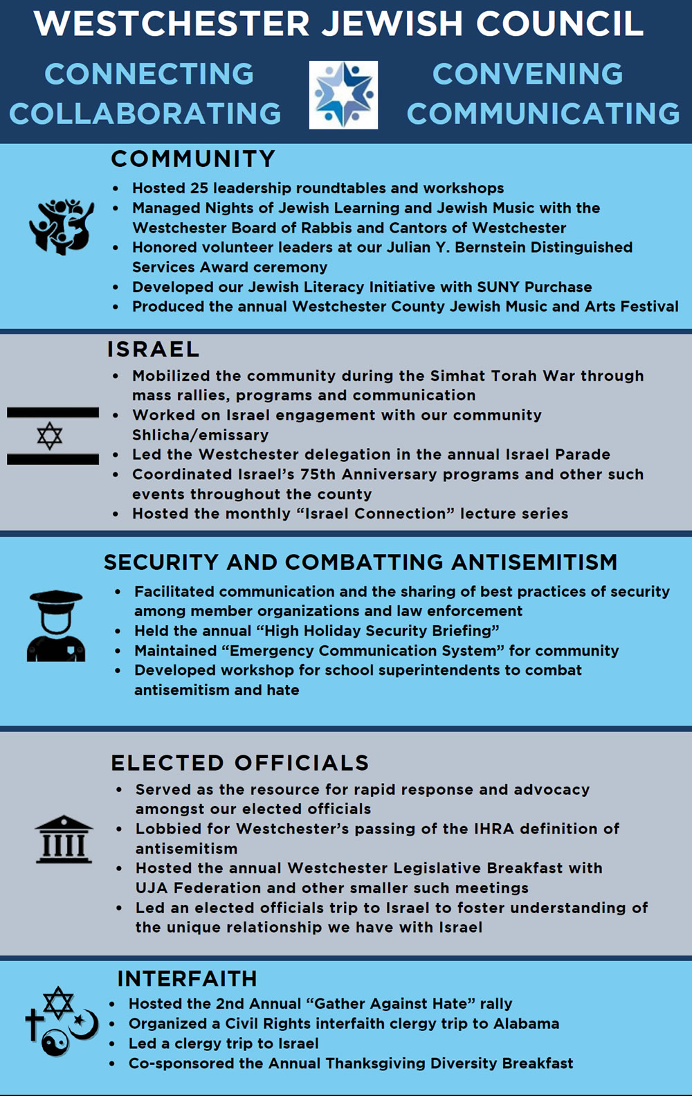 Through our work, we connect, convene, and safeguard Westchester's Jewish communities and strengthen relationships among Jews and our member organizations, all of Westchester to Israel, Jews and our member organizations to our elected officials, and Jews and our member organizations to other ethnic and faith-based individuals and organizations, as well as to the community at large.