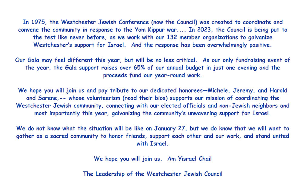 The Westchester Jewish Council Gala is our organization's sole fundraising event of the year.  Your support of the gala allows us to devote as much time as possible to continuing our enduring mission.  With 130 member organizations and hundreds of donors like you, we have accomplished a great deal year in and year out since 1975.