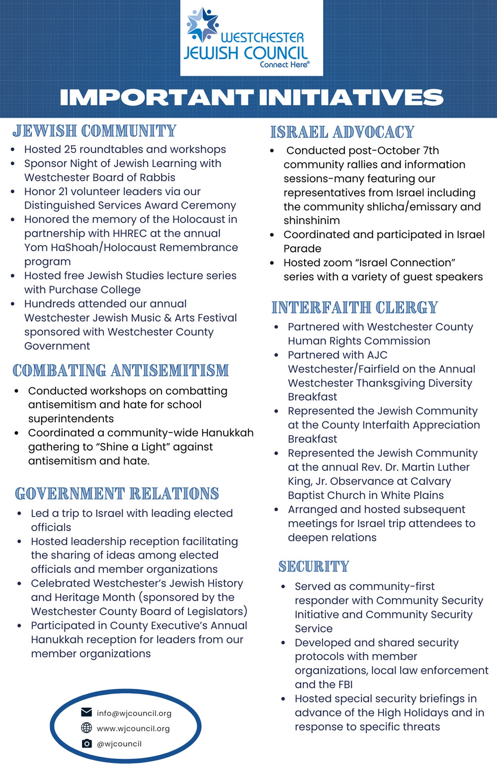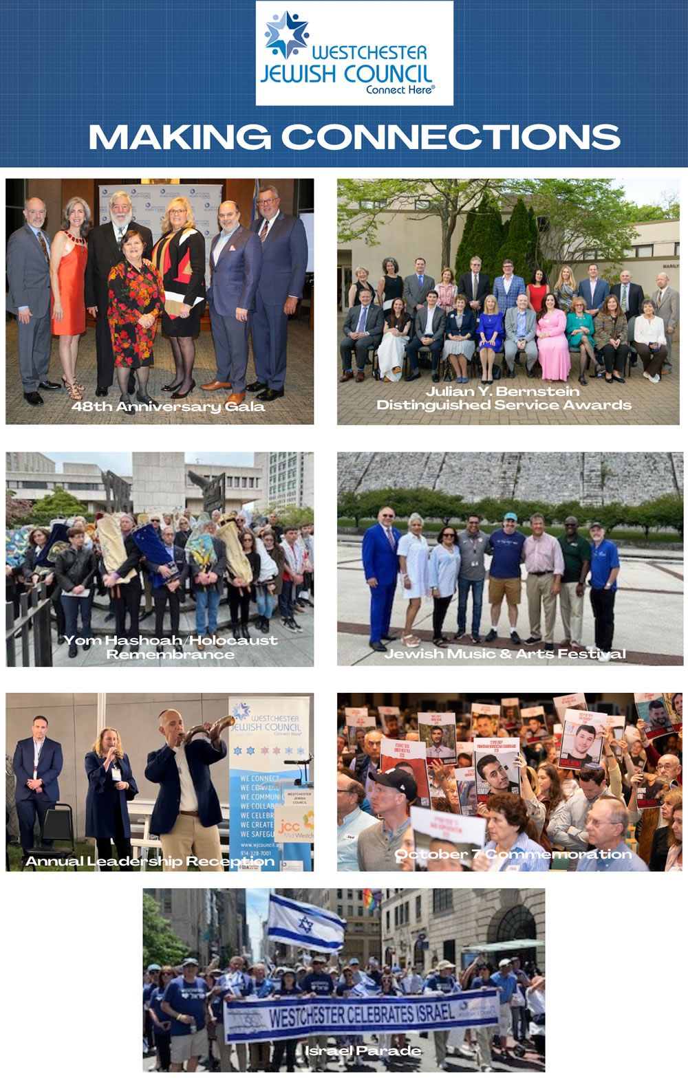 Through our work, we connect, convene, and safeguard Westchester's Jewish communities and strengthen relationships among Jews and our member organizations, all of Westchester to Israel, Jews and our member organizations to our elected officials, and Jews and our member organizations to other ethnic and faith-based individuals and organizations, as well as to the community at large.