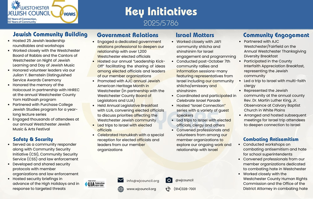 Through our work, we connect, convene, and safeguard Westchester's Jewish communities and strengthen relationships among Jews and our member organizations, all of Westchester to Israel, Jews and our member organizations to our elected officials, and Jews and our member organizations to other ethnic and faith-based individuals and organizations, as well as to the community at large.
