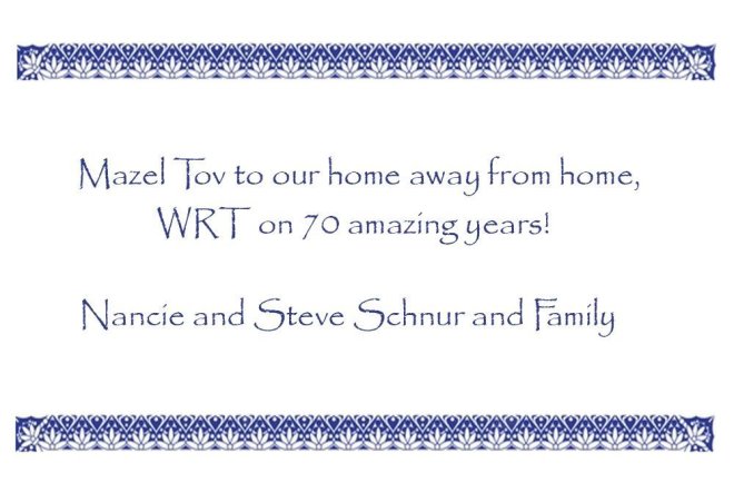 Congratulations WRT on 70 years! The Guggenheimer Family Mazel Tov Rabbi Blake on 20 Years at WRT! Lyn, Jordana, Ben & Noah Kaller and Rob Rosenblatt The Kaller Family Mazel Tov to WRT at 70 and thank you to Rabbi Blake and the wonderful clergy! Vicki Kravitz