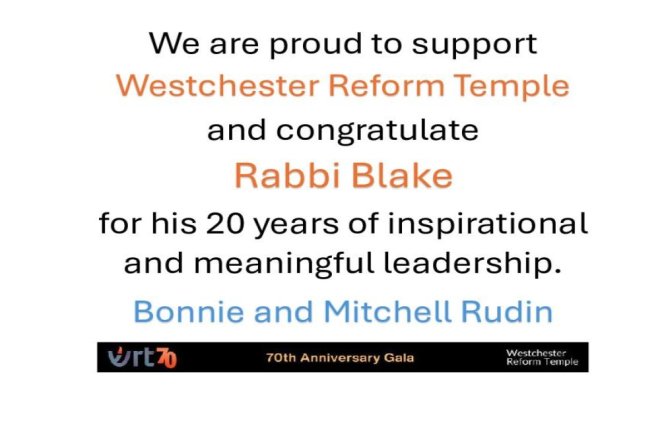 Mazel Tov to Rabbi Blake on 20 Years at WRT and to WRT's 70th Anniversary! - Ilissa & Jonathan Siegel Best Wishes to Westchester Reform Temple on its 70th Anniversary! Terry & Paul Singer